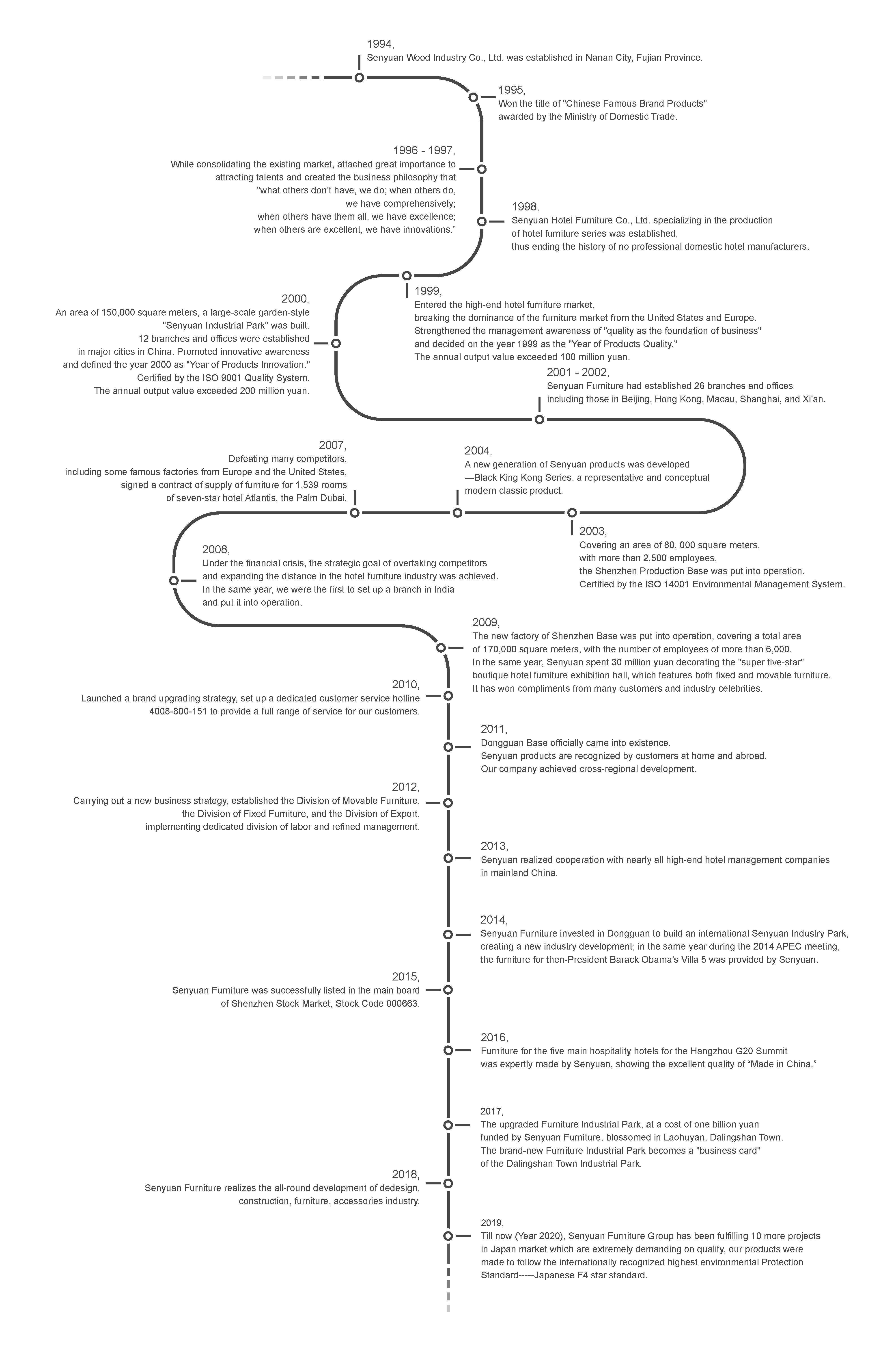 Being committed to the improvement of furniture craftsmanship technology and quality, Senyuan Furniture has a large-scale technical research and development team with more than 300 professionals. It’s certified by the ISO9001: 2008 Quality Management System, the ISO14001: 2004 Environmental Management System, OHSAS18000 Occupational Health and Safety Management System, the China Environmental Labeling Product (Ten Ring Certificate), and CQC. It has also won the World Hotel Five Continents Diamond Award granted by the World Hotel Union. Among other domestic and international honors, Senyuan was invited to participate in the annual meeting of the China Decoration Association and listed as industrial demonstration base for furniture companies. Senyuan Furniture is committed to creating "the first choice for consumers and best platform for practitioners." Keeping that in mind, we forge ahead!