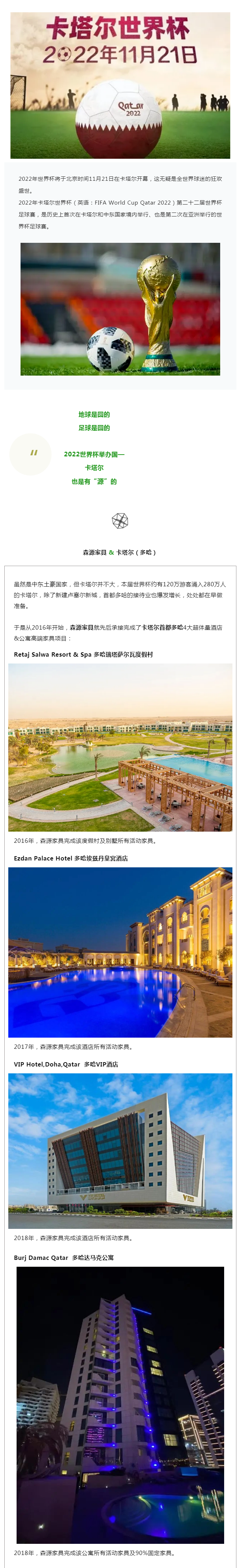 森源家具十分開心卡塔爾迎來了2022**杯,也十分榮幸能為其首都多哈,在本屆**杯接待酒店中貢獻(xiàn)一點(diǎn)力量。