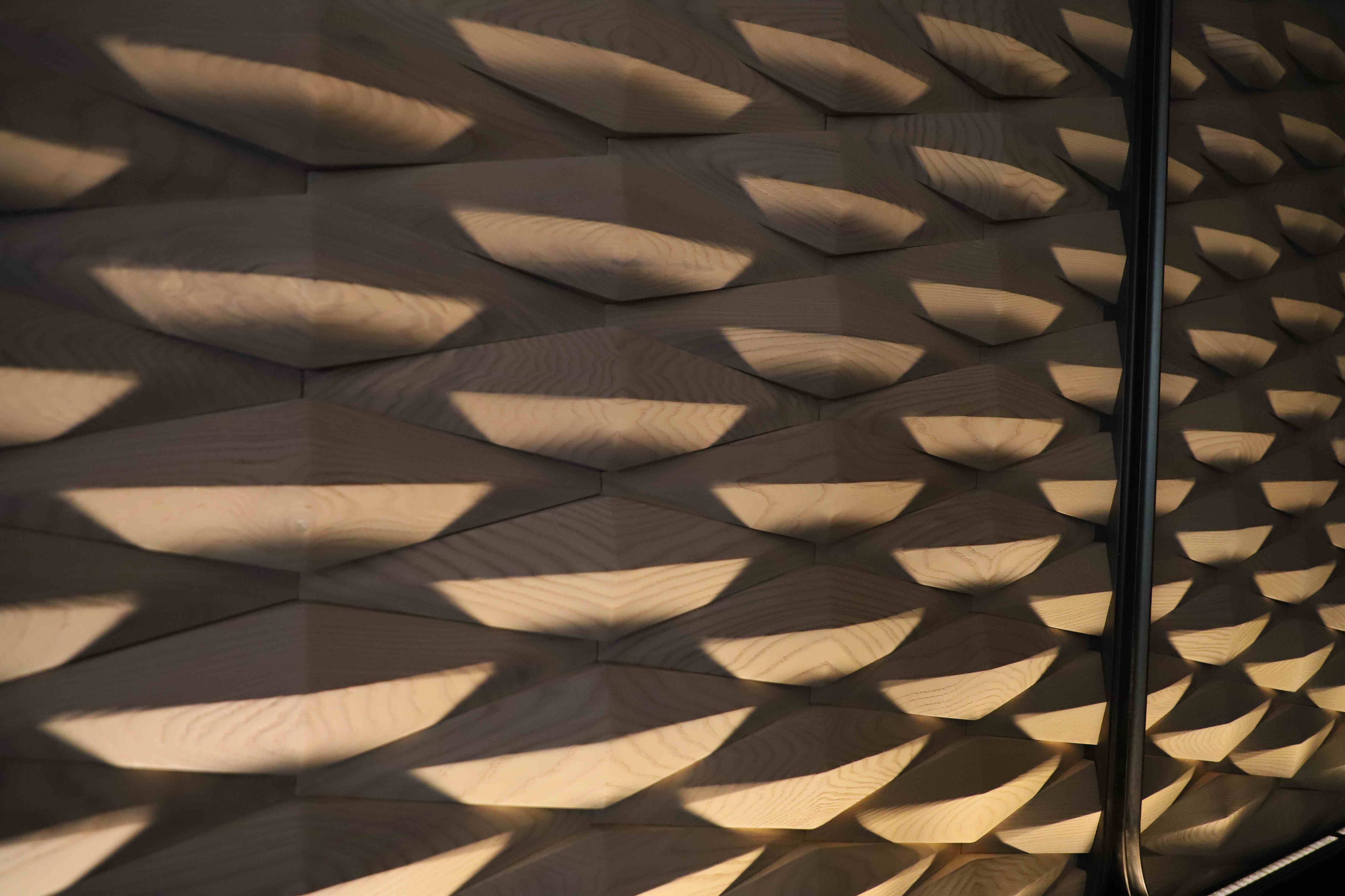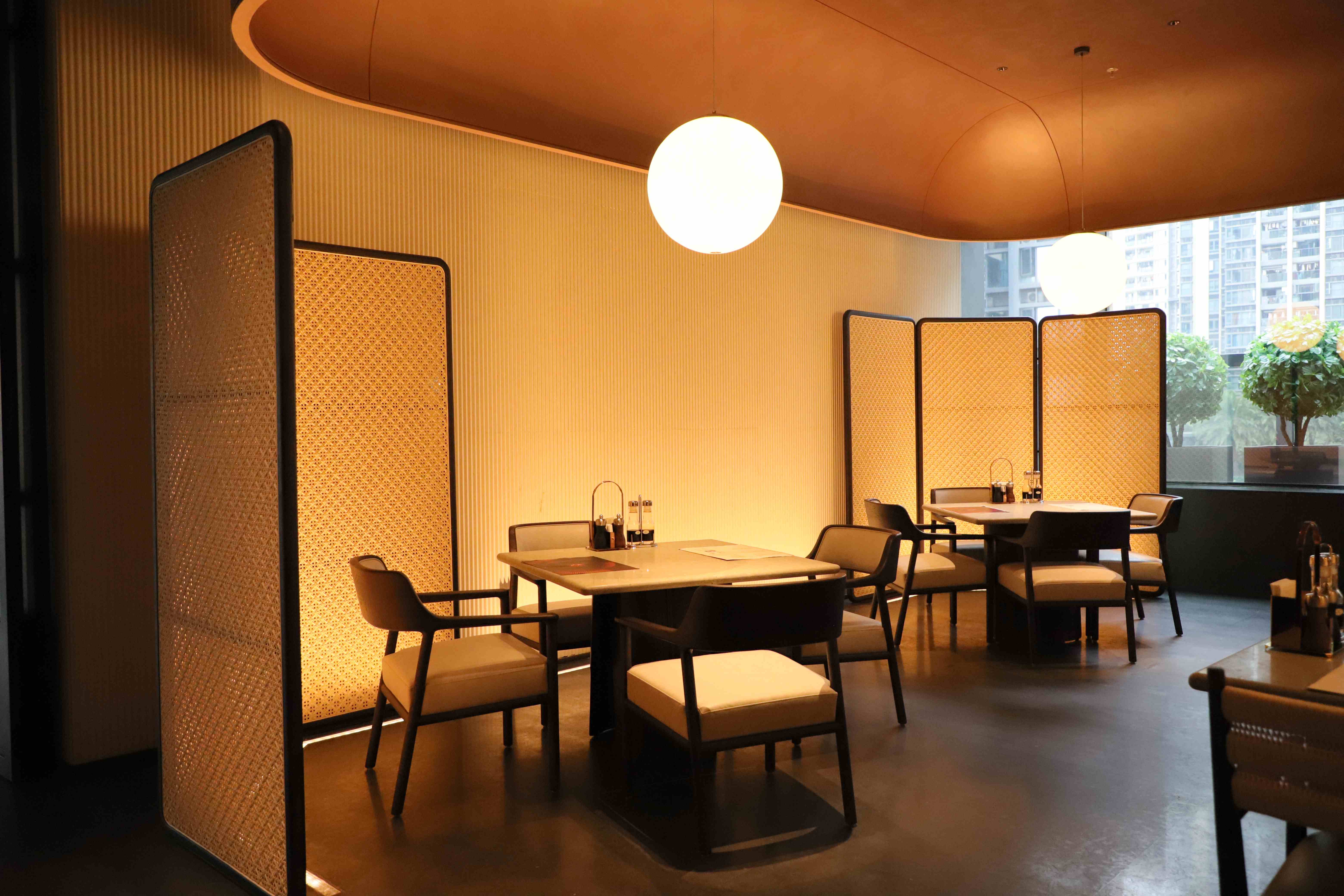 純天然木材打造的菱形屏風在燈光照應下猶如陽光下熠熠生輝的魚鱗,既起到美化環(huán)境增添藝術氛圍,也很好提升空間隱私度,為賓客提供靜謐交談的專屬空間。