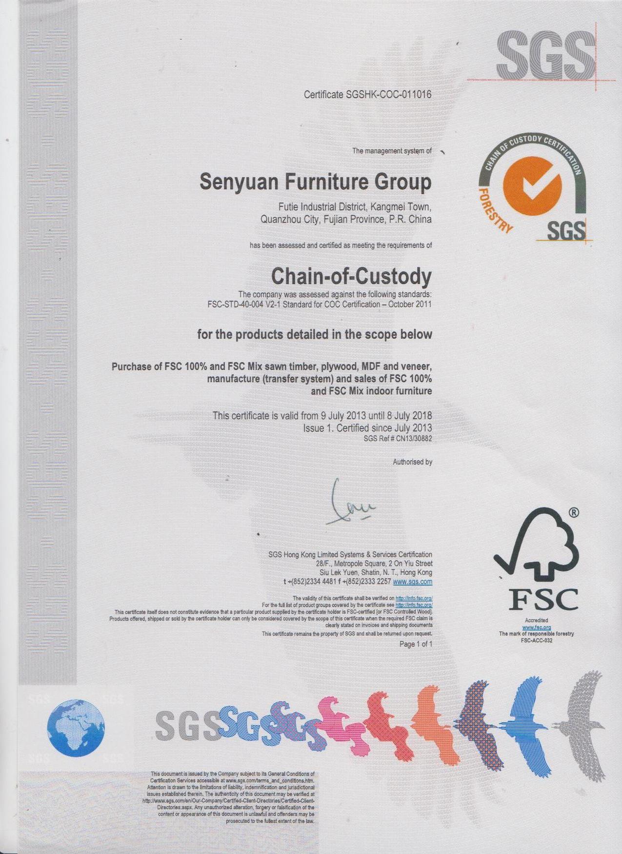 2013年7月12號,森源收到SGS(瑞士通用公證行,從事檢驗、測試、質(zhì)量保證與認(rèn)證的知名國際機構(gòu))頒發(fā)FSC